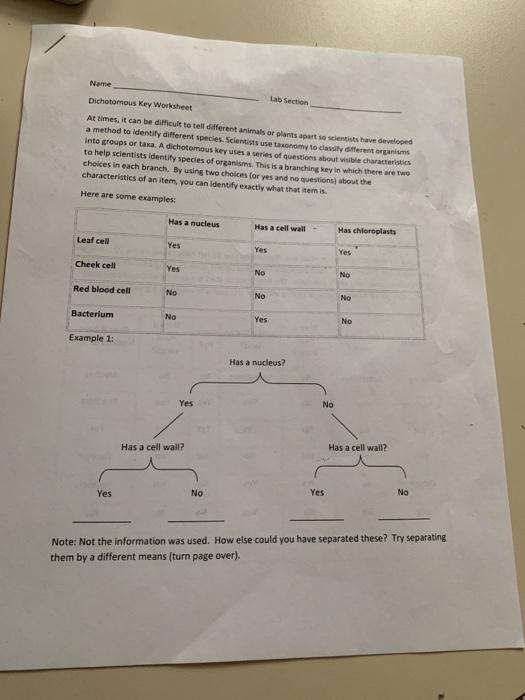 Solved Name Lab Section Dichotomous Key Worksheet At Time Chegg Com